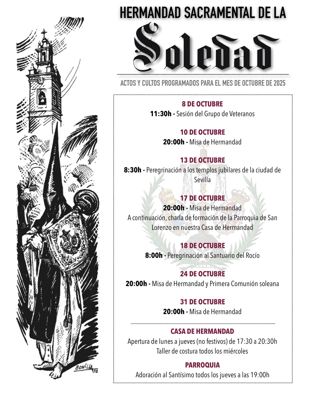 20:00h – Misa de Hermandad. A continuación, charla de formación de la Parroquia de San Lorenzo en nuestra Casa de Hermandad