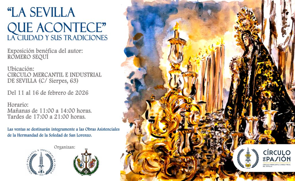 «La Sevilla que acontece. La ciudad y sus tradiciones» es la exposición temporal que reunirá obras del artista D. Pedro Romero Sequí en el Círculo Mercantil e Industrial de Sevilla (c/ Sierpes n.º 63) del 11 al 16 de febrero. La exposición se engloba dentro de «Círculo de Pasión», el programa cultural del CMI dedicado a las Cofradías durante el tiempo cuaresmal.